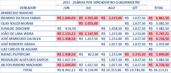 Dos analisados apenas o Vereador Bianco na havia deferido nenhum diária no período analisado, conforme o levantamento acima.